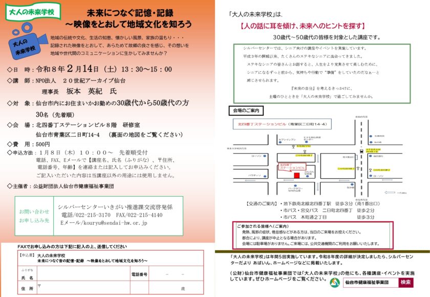 シルバーセンターいきがい推進課主催の「大人の未来学校」にて昔の映像等の上映会を開催いたします。